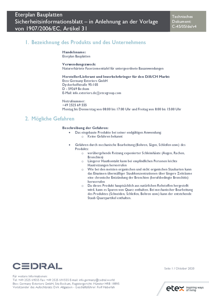 Sicherheitsinformationsblatt Eterplan Bauplatte Sicherheits- Informationsblatt Sicherheitsinformationsblatt Eterplan Bauplatte Eterplan Bauplatte