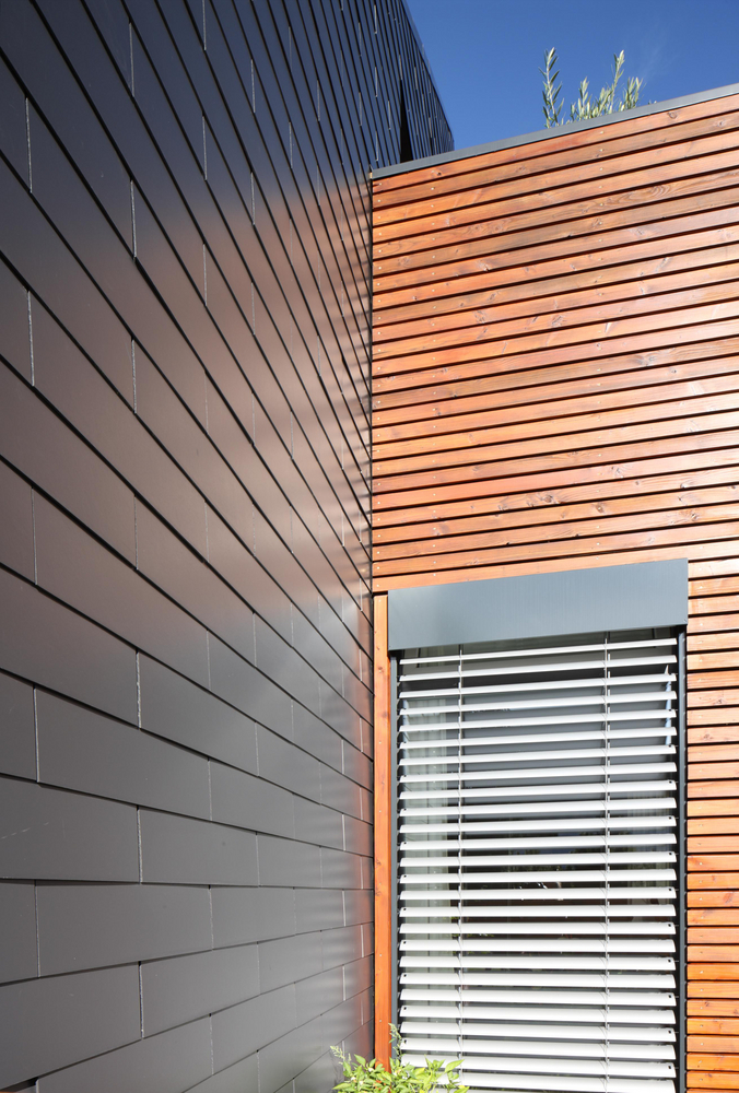 Die Fassadenplatten wurden wie Mauerwerk im Verbund verlegt, um ein geschlossenes, flaches Erscheinungsbild zu erzielen.