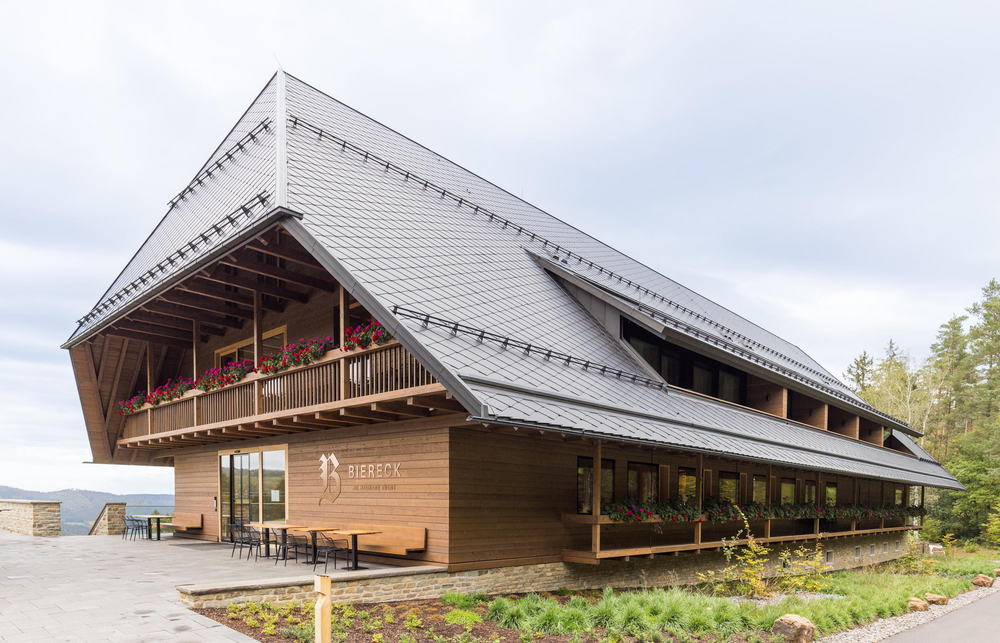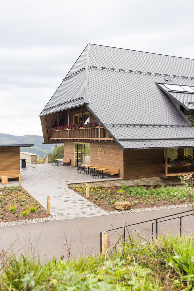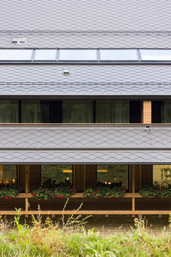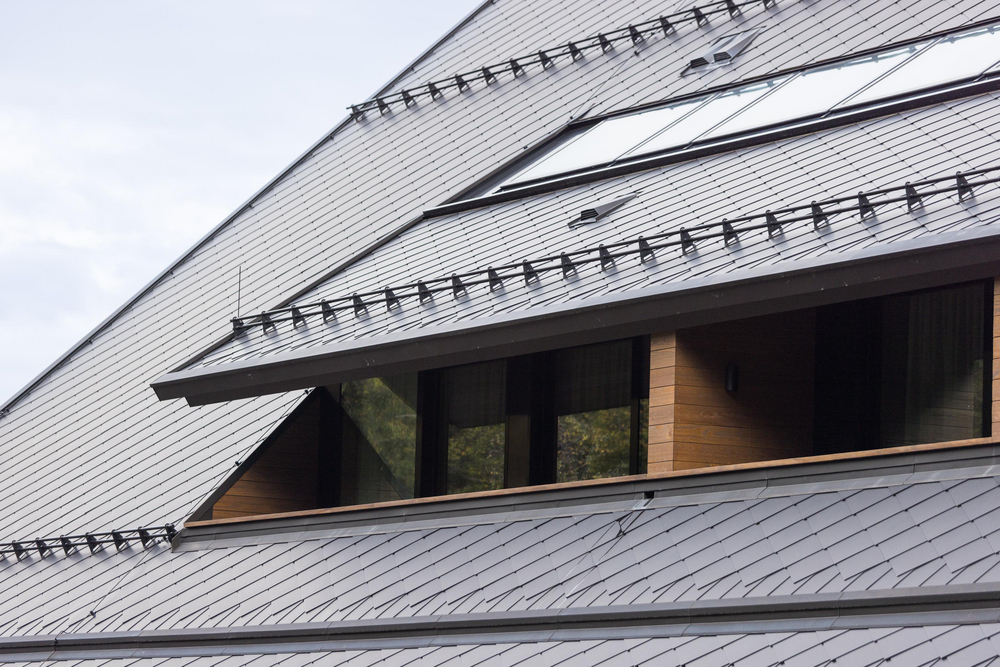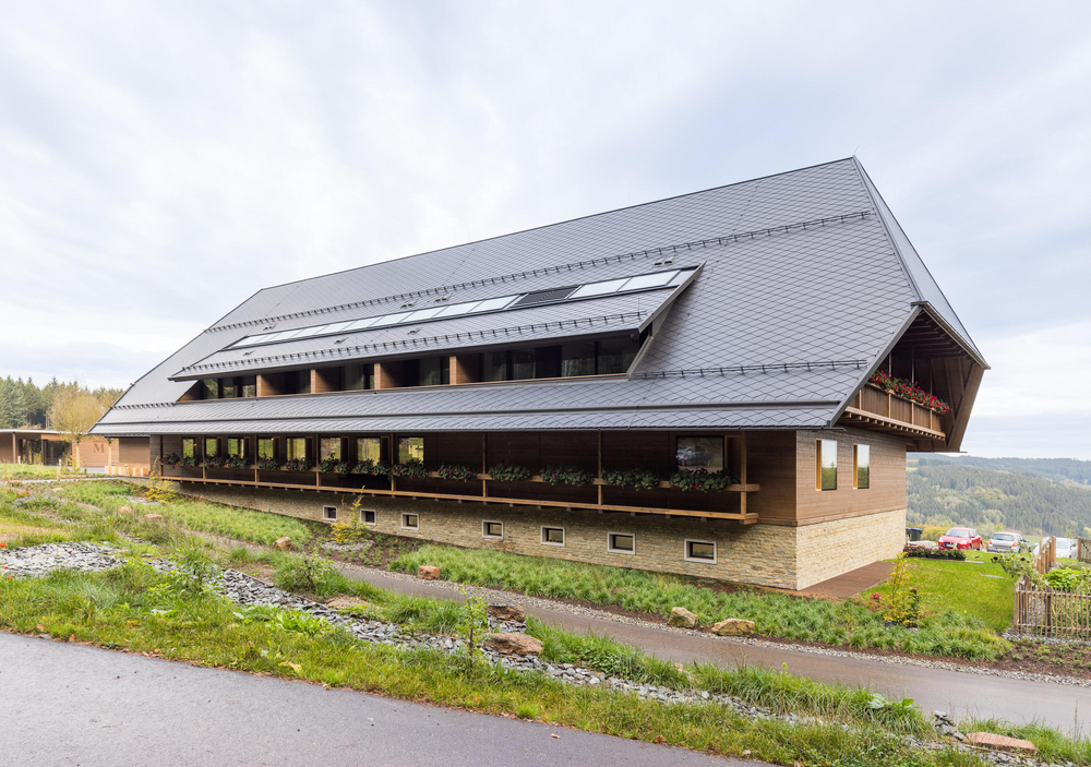 Das Dach des Hotels wurde mit langlebigen Cedral Dachplatten bekleidet, die besonders witterungsbeständig und wartungsarm sind. Sie verleihen dem Dach eine moderne Ästhetik und harmonieren bestens mit der holzverschalten Fassade des Gebäudes. Die Wahl für die Dachdeckung auf die langlebigen Cedral Dachplatten in traditioneller Rhombus-Deckung. Die Faserzementplatten im Format 40 x 44 Zentimeter eignen sich besonders gut für große, geschlossene Dachflächen, die sich optisch zurücknehmen. Dank der großformatigen Platten lässt sich diese Cedral Deckung besonders schnell verlegen – vorzugsweise auf einer Holzlattung.