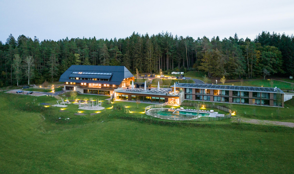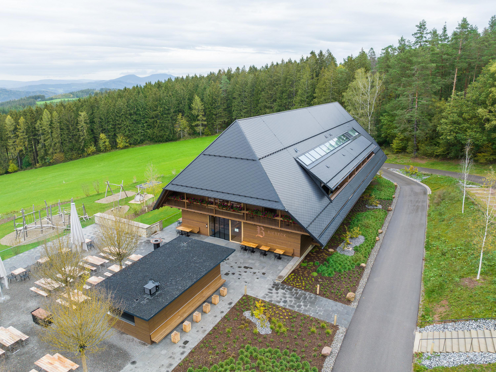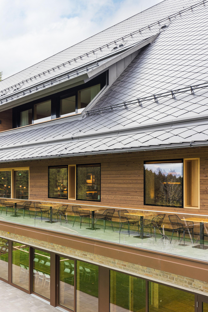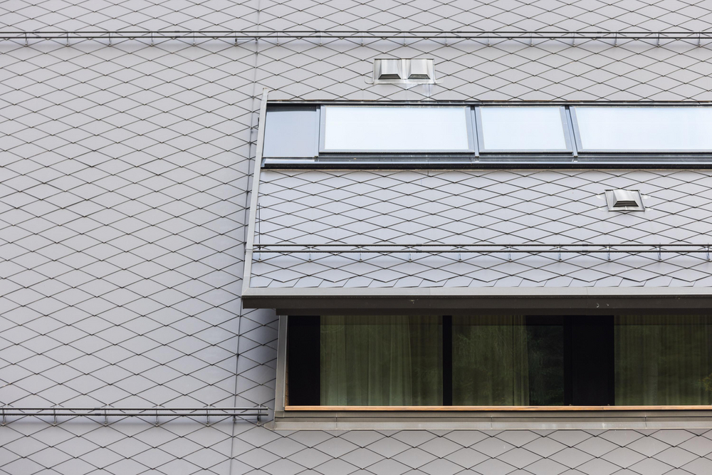 Das Dach des Hotels wurde mit langlebigen Cedral Dachplatten bekleidet, die besonders witterungsbeständig und wartungsarm sind. Sie verleihen dem Dach eine moderne Ästhetik und harmonieren bestens mit der holzverschalten Fassade des Gebäudes. Die Wahl für die Dachdeckung auf die langlebigen Cedral Dachplatten in traditioneller Rhombus-Deckung. Die Faserzementplatten im Format 40 x 44 Zentimeter eignen sich besonders gut für große, geschlossene Dachflächen, die sich optisch zurücknehmen. Dank der großformatigen Platten lässt sich diese Cedral Deckung besonders schnell verlegen – vorzugsweise auf einer Holzlattung.