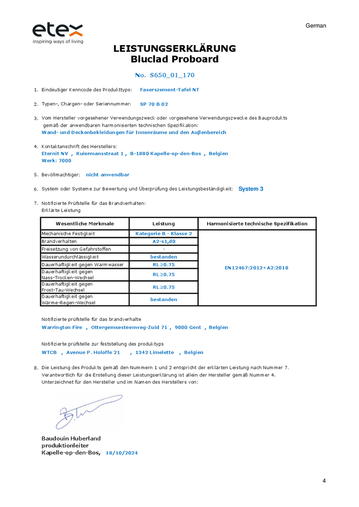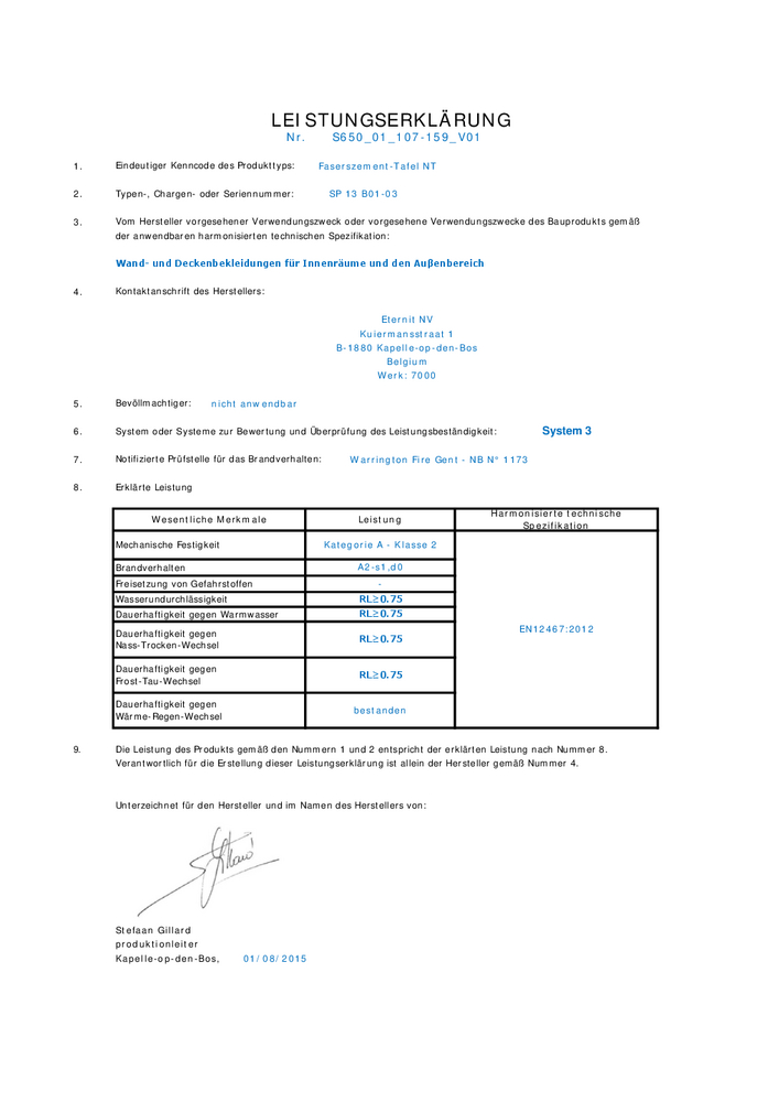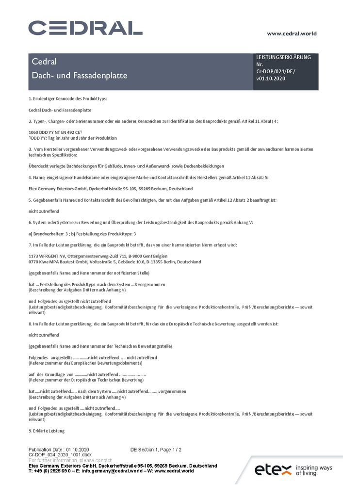 Leistungserklärung Dach- & Fassadenplatten Leistungserklärung Leistungserklärung Dach- & Fassadenplatten Cedral Dach- & Fassadenplatten