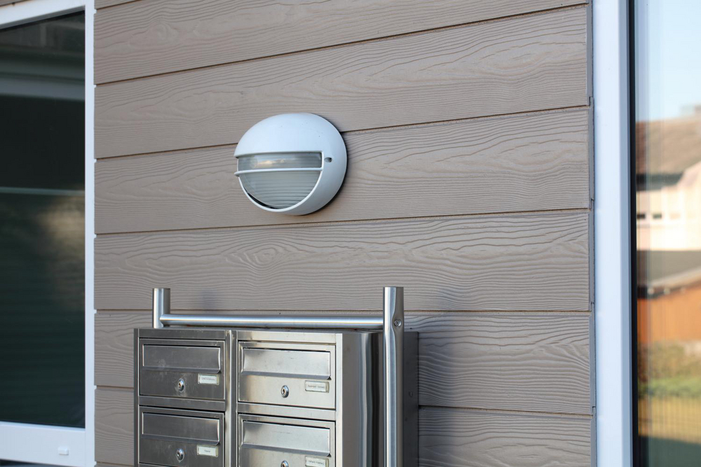 Der Neubau wurden in den ersten beiden Geschossen mit Klinker ausgeführt. Das Staffelgeschoss mit umlaufender Terrasse sowie das komplette Treppenhaus wurde farblich passend zum Klinker mit Cedral Click mit strukturierter Oberfläche in Braun C 03 bekleidet.