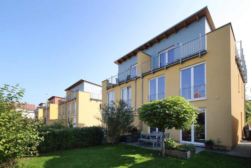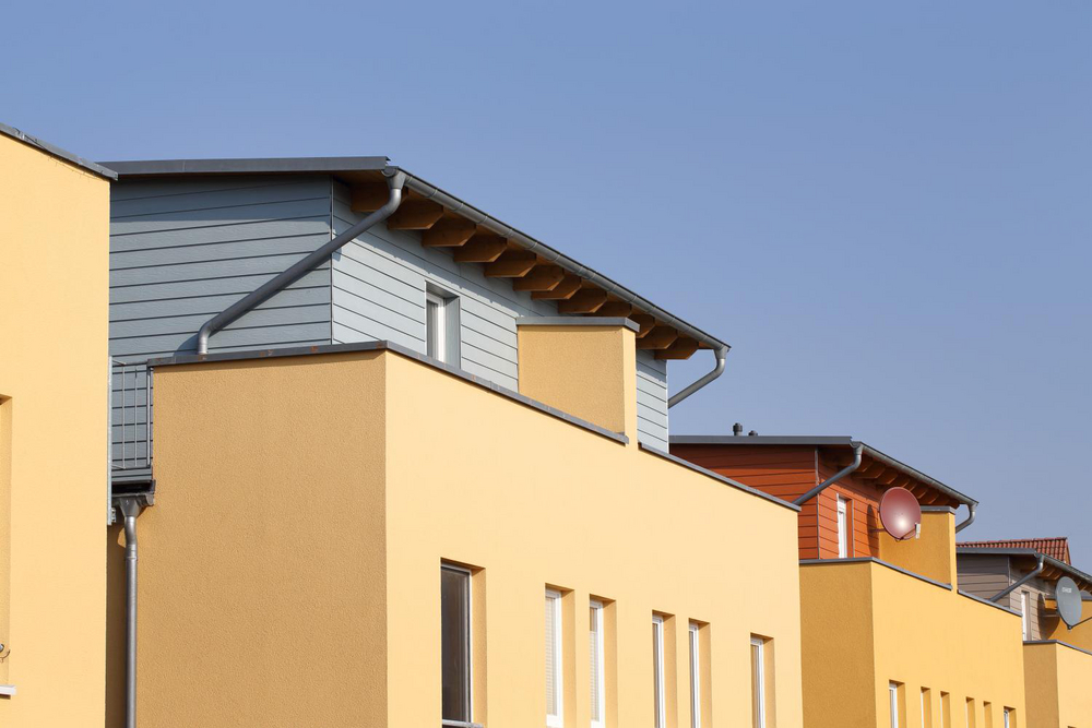 Die Staffelgeschosse der Mehrfamilienhäuser in Berlin wurden mit unterschiedlichen Farben ausgeführt: Orange, Blau und Braun. Dadurch erhalten die Hauser ihren individuellen Charakter. Die Farben heben sich sehr gut zu den ersten beiden Geschossen mit gelber Putzfassade ab. Insgesamt erscheint das Ensemble durch die Farbwahl sehr freundlich.