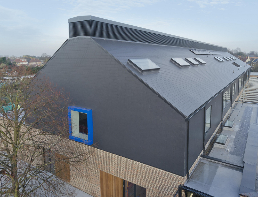 Situated just two miles from Heathrow and directly under the flight path, the school site poses some difficult energy efficiency, acoustic and thermal challenges. Pollard Thomas Edwards specified the Thrutone fibre cement slates for the main two storey section of the school, not only for the roof but also for vertical cladding, to help address these demands.