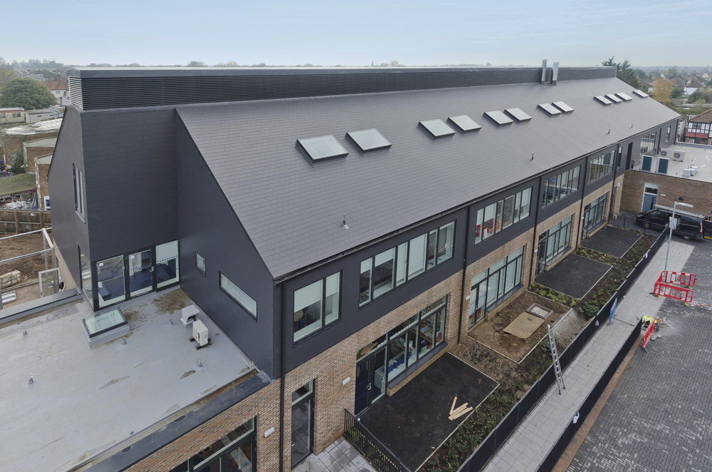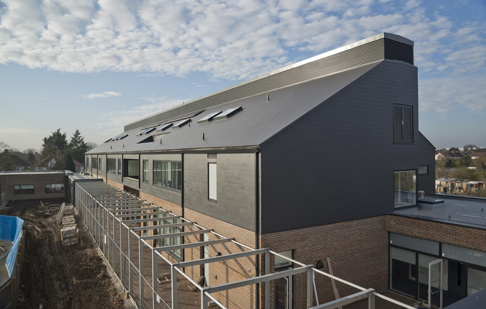 Situated just two miles from Heathrow and directly under the flight path, the school site poses some difficult energy efficiency, acoustic and thermal challenges. Pollard Thomas Edwards specified the Thrutone fibre cement slates for the main two storey section of the school, not only for the roof but also for vertical cladding, to help address these demands.
