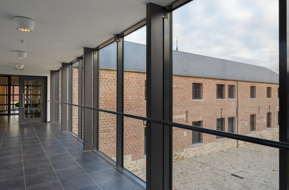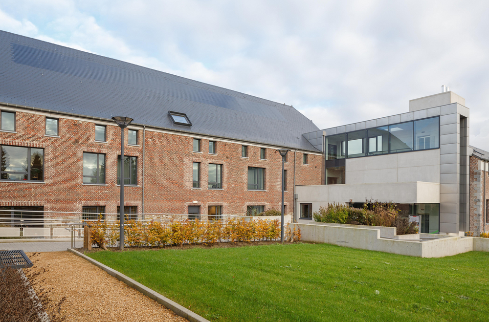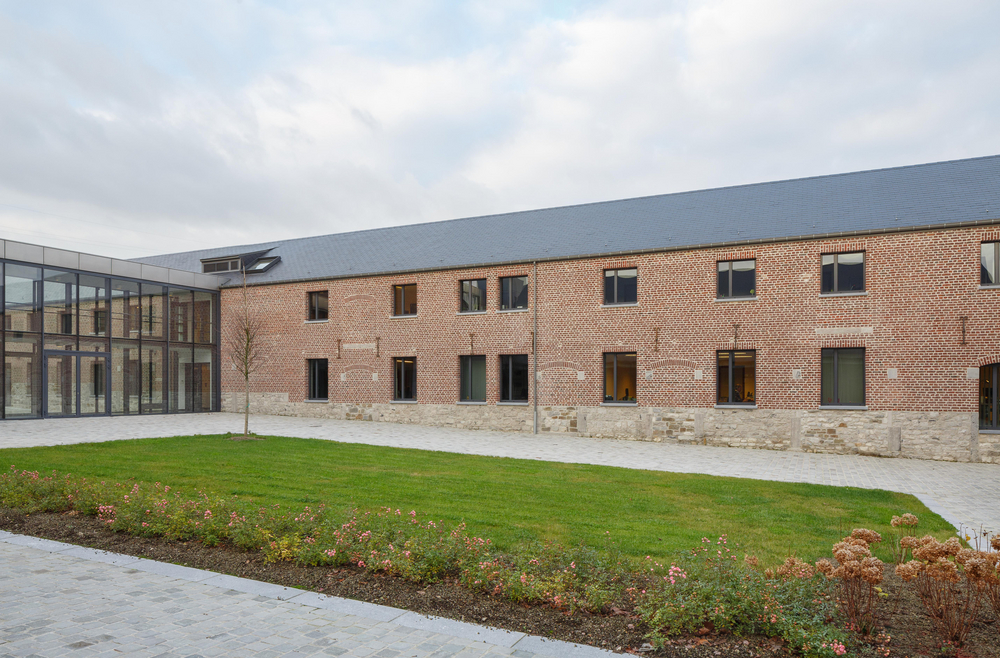 Cette grande ferme domaniale, classée Monument Historique en Belgique, a été construite en trois phases. L’ancienne cour de justice, transformée plus tard en laiterie, date du Moyen-Âge. Les écuries furent construites fin 17ième/début 18ième siècle et le corps de logis au début du 19ième siècle. Après avoir changé maintes fois de propriétaire, la ferme a été rachetée en 2008 par la commune de Wanze qui fit faire les travaux nécessaires de mai 2010 à fin 2012 pour la reconvertir en maison communale, annexe CPAS. Ce rachat permit la création d’une nouvelle infrastructure pour les services administratifs et sociaux, tout en sauvegardant le patrimoine de la commune. L’installation d’un système de chauffage à pellets, l’aménagement de citernes pour les eaux de pluie, l’isolation poussée des murs et toitures ainsi que les nouveaux revêtements de toit à base d’ardoises en fibres-ciment – à panneaux solaires intégrés – accentuent les principes de durabilité du projet.
