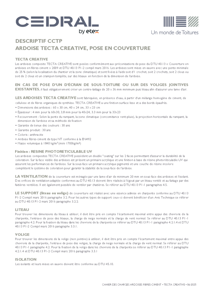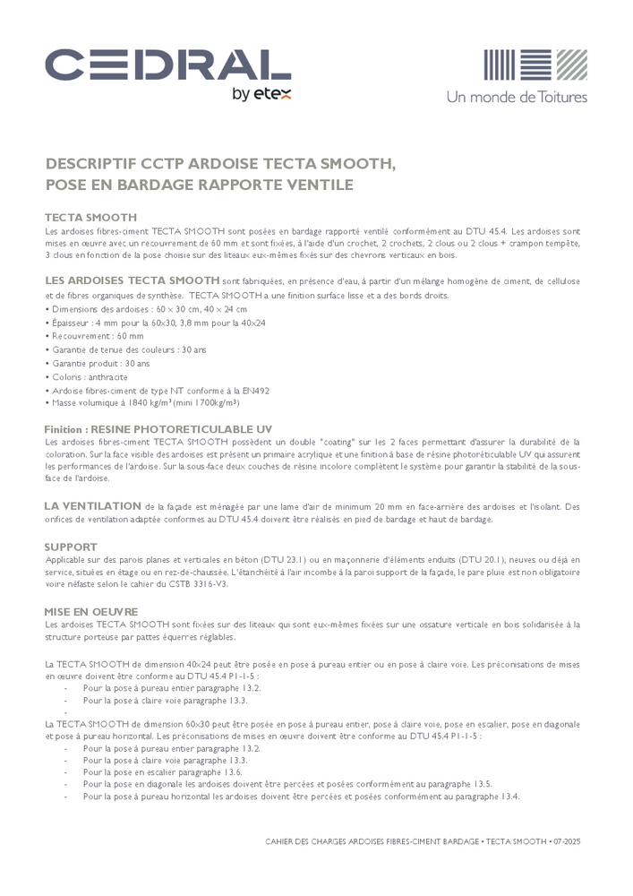 DESCRIPTIF CCTP ARDOISE TECTA SMOOTH, POSE EN BARDAGE RAPPORTE VENTILE Guide d'installation DESCRIPTIF CCTP ARDOISE TECTA SMOOTH, POSE EN BARDAGE RAPPORTE VENTILE