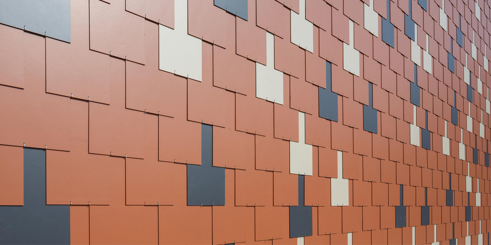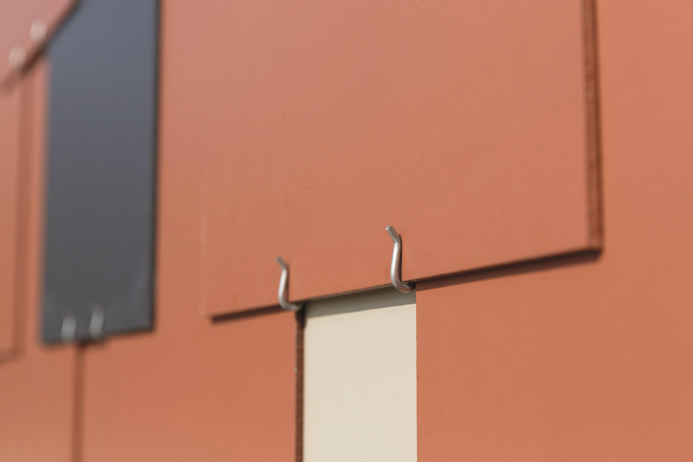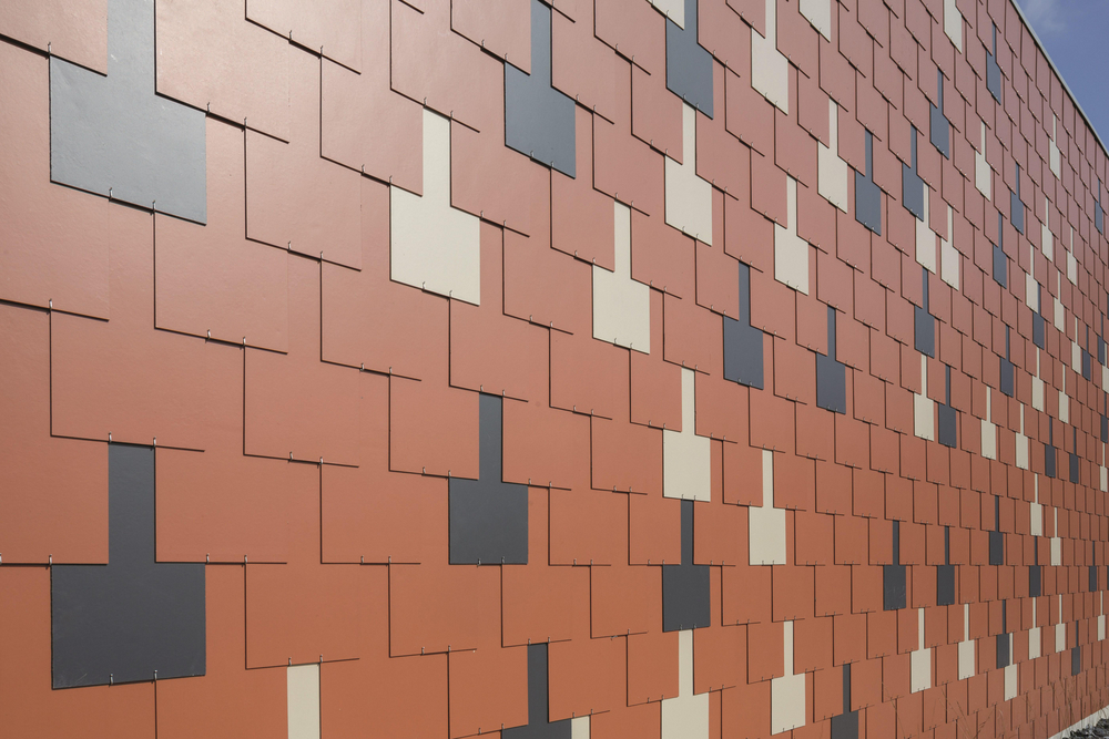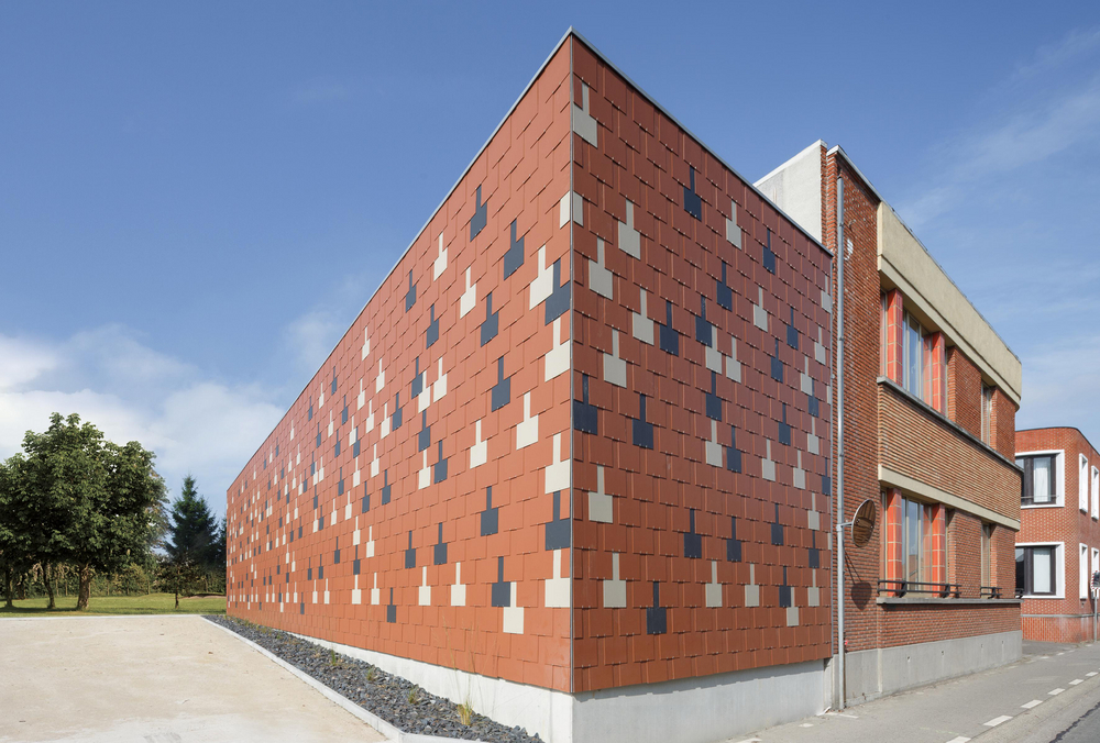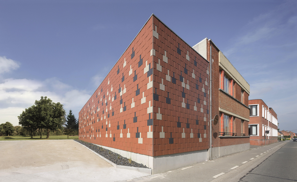 Un bâtiment neuf contemporain mais qui est en harmonie avec les bâtiments existants. Le maître de l’ouvrage a opté ici pour une façade à trois teintes : rouge terre cuite avec des accents gris zinc et brun gris. Le résultat est une élégante palette de couleurs qui se marie parfaitement avec les autres bâtiments en briques
