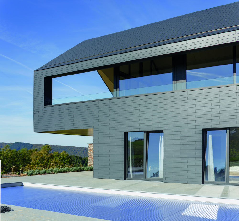 Pour la finition en ardoises, le maître de l’ouvrage a opté pour un appareil à joints alternés. La structure linéaire réaffirme le volume horizontal du bâtiment et forme une jolie combinaison avec le mur en briques contemporain.