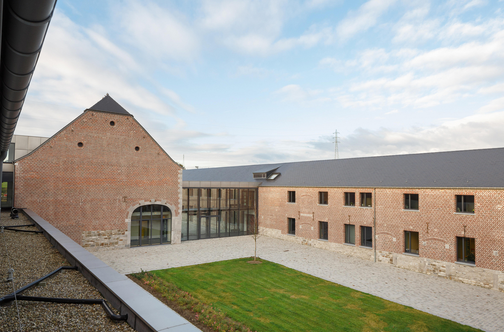 Cette grande ferme domaniale, classée Monument Historique en Belgique, a été construite en trois phases. L’ancienne cour de justice, transformée plus tard en laiterie, date du Moyen-Âge. Les écuries furent construites fin 17ième/début 18ième siècle et le corps de logis au début du 19ième siècle. Après avoir changé maintes fois de propriétaire, la ferme a été rachetée en 2008 par la commune de Wanze qui fit faire les travaux nécessaires de mai 2010 à fin 2012 pour la reconvertir en maison communale, annexe CPAS. Ce rachat permit la création d’une nouvelle infrastructure pour les services administratifs et sociaux, tout en sauvegardant le patrimoine de la commune. L’installation d’un système de chauffage à pellets, l’aménagement de citernes pour les eaux de pluie, l’isolation poussée des murs et toitures ainsi que les nouveaux revêtements de toit à base d’ardoises en fibres-ciment – à panneaux solaires intégrés – accentuent les principes de durabilité du projet.