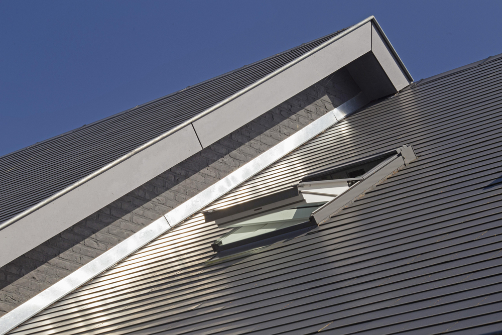 La raison d‘être du double toit posé en perpendiculaire n’est pas uniquement esthétique: en effet, cette solution a évolué à partir des diverses utilisations de l‘immeuble. Le toit plus pentu et plus pointu abrite les chambres d‘amis supplémentaires; l‘autre, moins incliné, fournit davantage de volume et de générosité aux espaces qu‘il surplombe. L‘utilisation des mêmes ardoises d‘Eternit pour les toits et les pignons crée une unité entre les divers éléments de la maison; de même, tous les matériaux sont soigneusement accordés entre eux au niveau du rendu des surfaces et de la couleur. En dépit de son aspect extérieur modeste, cette maison peu conventionnelle est étonnamment vaste et offre une grande diversité spatiale. Elle s‘intègre harmonieusement dans la rangée de maisons doubles, sa différence ne se révélant que dans le détail.