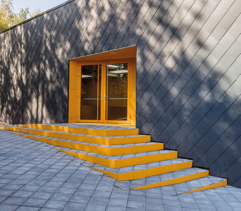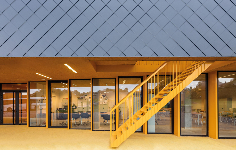 Deze school in het hart van de Ardennen bestaat uit een hoofdvolume dat integraal bekleed is met vezelcementleien en een eenlagig balkvolume in cederhout. De gevels van het hoofdvolume gaan uit van een contrast tussen donkergrijze leien in een ruitpatroon en grote gele vezelcementpanelen. De architecten namen geen vrede met de veelgebruikte "klassieke plaatsingswijze", waarbij de lijnmotieven iets minder strak staan door de noodzakelijke overlap. Ze kozen voor de gevel een uitgepuurd dambordeffect en wilden graag onzichtbare bevestigingshaken. Er is uiteindelijk gewerkt met koperen haken, die door de jaren heen geleidelijk aan het oog onttrokken worden doordat ze vergrijzen.