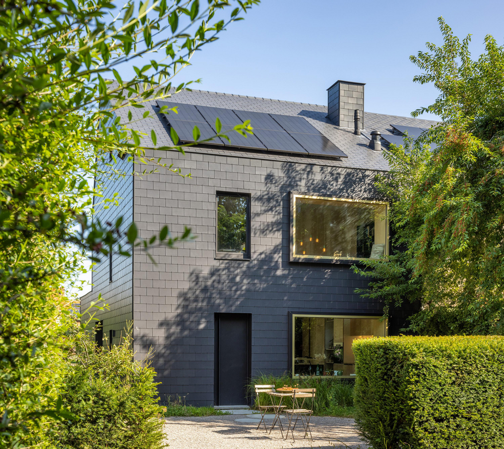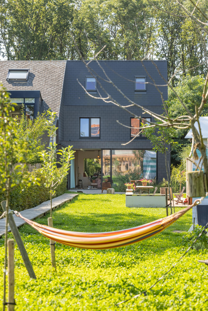 Deze gezinswoning in Brugge is volledig gerenoveerd. De originele woning werd gebouwd met een gele gevelsteen, voor de renovatie kozen de eigenaars voor Cedral Boronda leien in donkergrijs. Zowel de gevel als het dak werden bekleed met hetzelfde materiaal, wat zorgt voor een mooi, modern en uniform geheel. De vooruitstekende houten ramen zorgen voor een interessant contrast