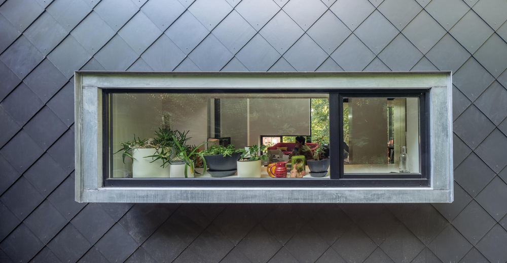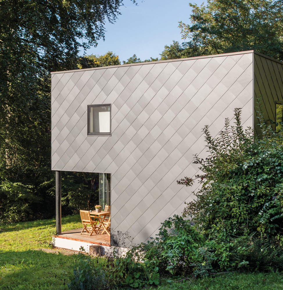 Op het eerste gezicht lijkt deze tweewoonst in de Luikse natuur een geheel. Enkel in het midden wordt het volume gesplitst door een metalen structuur voor toekomstig groen. Een knappe finishing touch, met oog voor nuance.