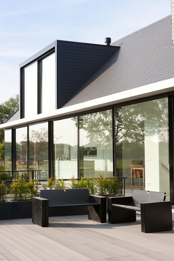 Wat er aanvankelijk uitziet als een eenvoudig rechthoekig blok met daarboven een zadeldak, ontpopt zich langs binnen tot een complexe compositie van ruimten die de moderne woonfuncties alle eer aandoen. De aanblik langs buiten wordt bepaald door duidelijke geometrische vormen en transparantie. Langs de kant van de straat leiden betonnen treden naar de kelderverdieping; aan de achterkant wordt die lijn doorgetrokken in de vorm van een helling die uitgeeft op de tuin. Het erg licht en elegant werkende dak is bedekt met donkere leien in vezelcement.