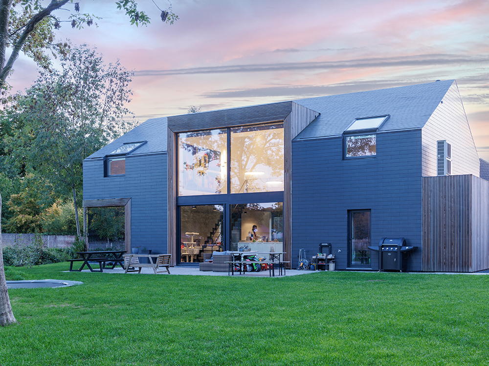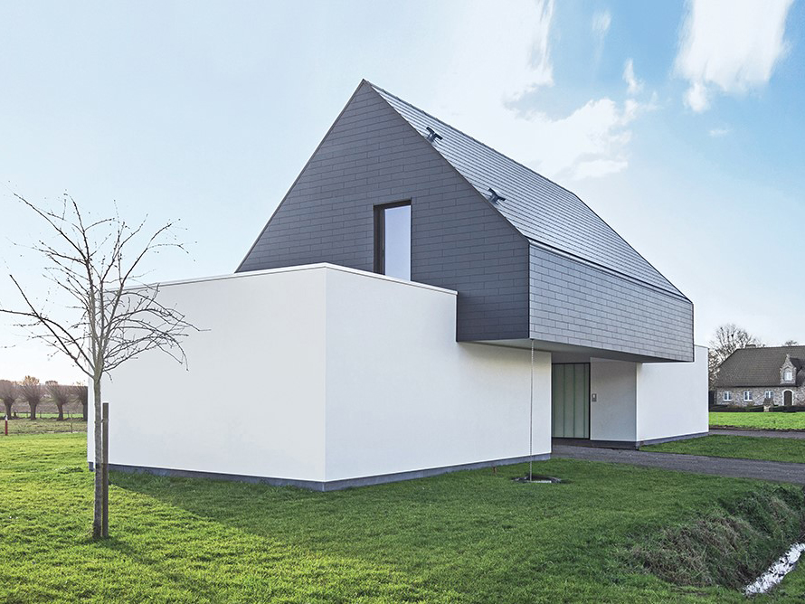 Voor de afwerking kozen we voor Cedral leien. Deze zijn duurzaam, gemaakt uit 100% vezelcement, een inert materiaal dat geen insecten of ongedierte aantrekt. Met leien creëer je een strakke moderne look.