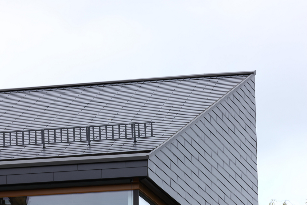 Nowoczesna bryła budynku podkreślona horyzontalnym ułożeniem płytek.