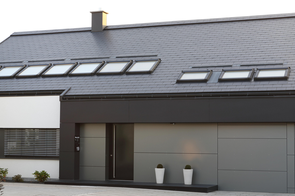 Powierzchnia dachu pokryta wzorem podwójnym przechodzi płynnie i łączy się, stanowiąc integralną całość z elewacją.