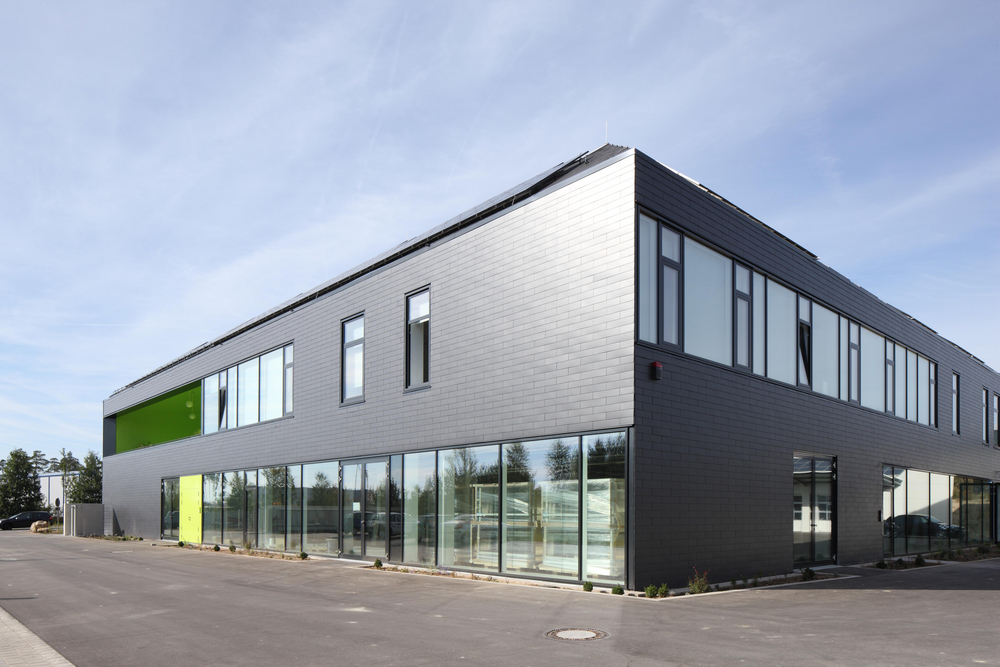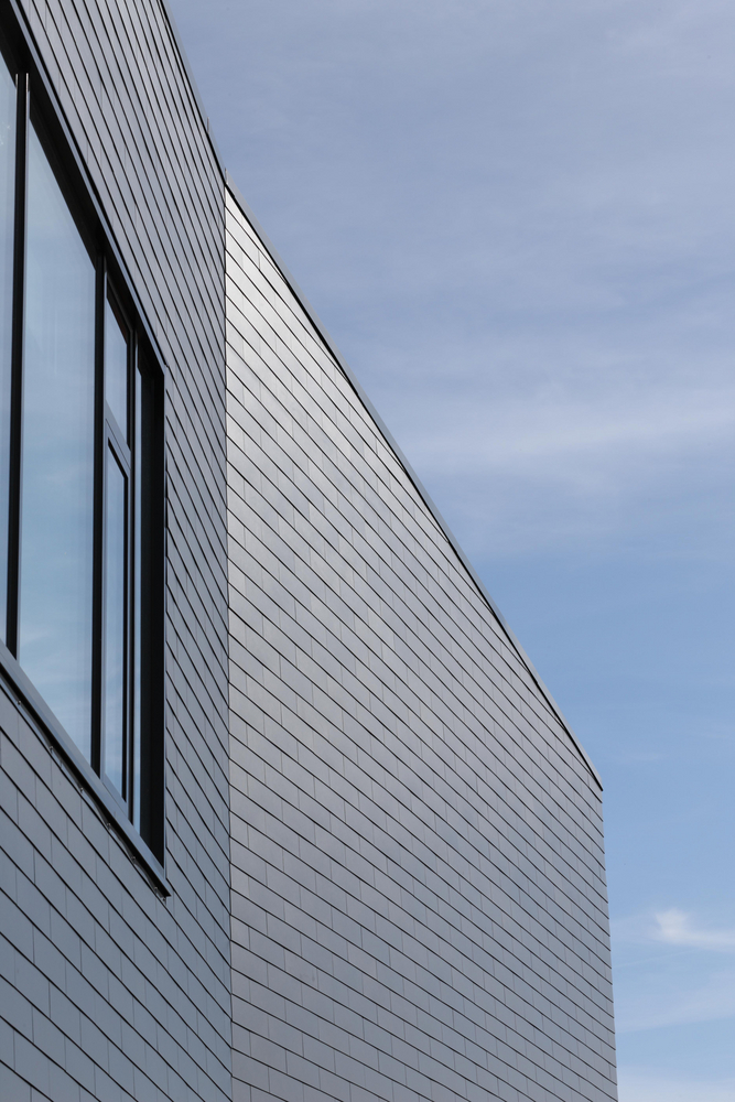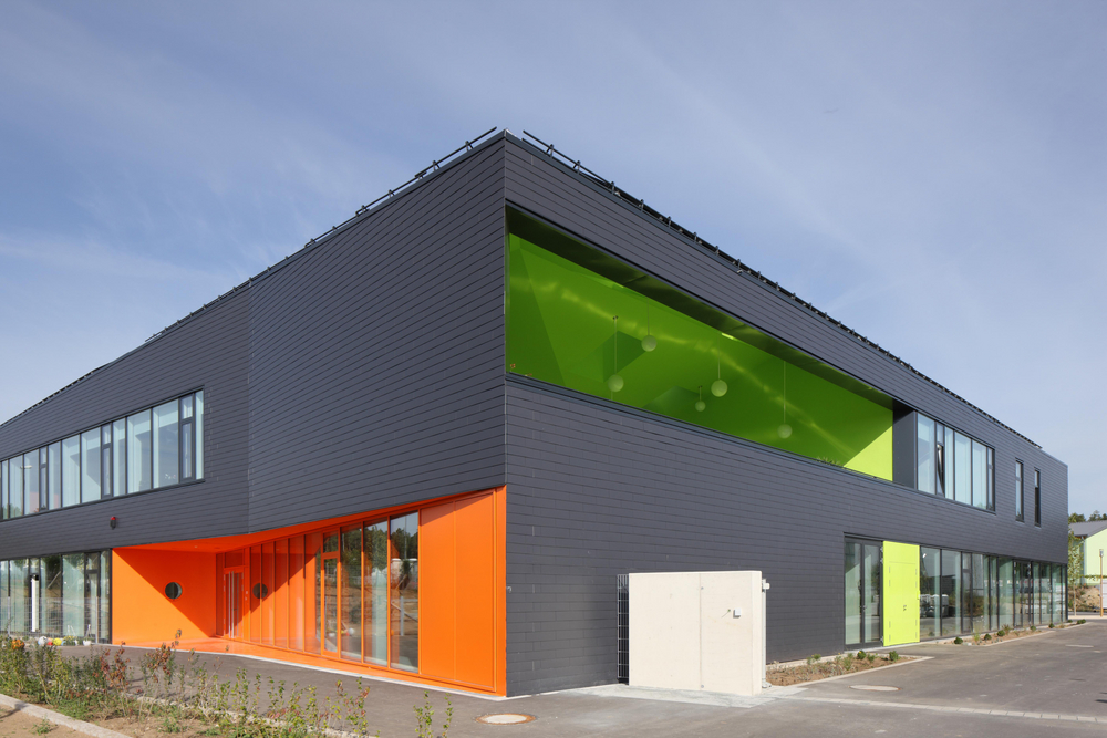 Elewacja i dach zostały całkowicie pokryte małoformatowymi płytami z włóknocementu Cedral w ciemnym odcieniu, co nadało budynkowi jednolity i spokojny wygląd, kontrastujący z intensywnymi barwami zastosowanymi w pozostałej części projektu.